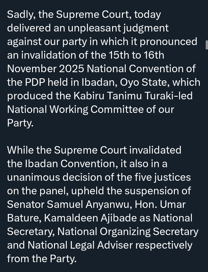 The BoT disclosed that the apex court invalidated the PDP’s National Convention held between November 15 and 16, 2025, in Ibadan, which produced the National Working Committee led by Kabiru Tanimu Turaki.