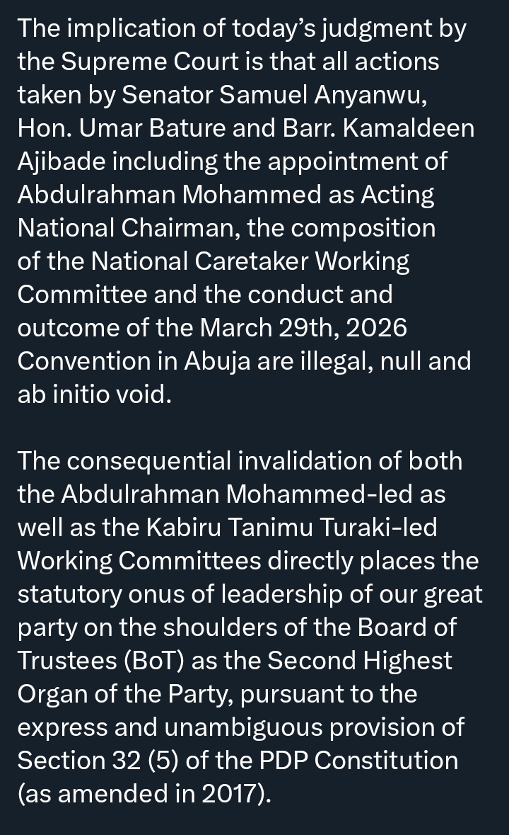 According to the BoT, the judgment renders all decisions taken by the affected officials invalid, including the appointment of Abdulrahman Mohammed as Acting National Chairman and the formation of a caretaker committee.