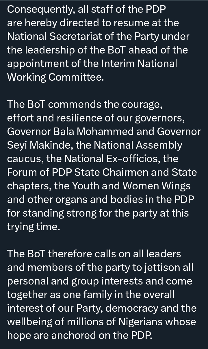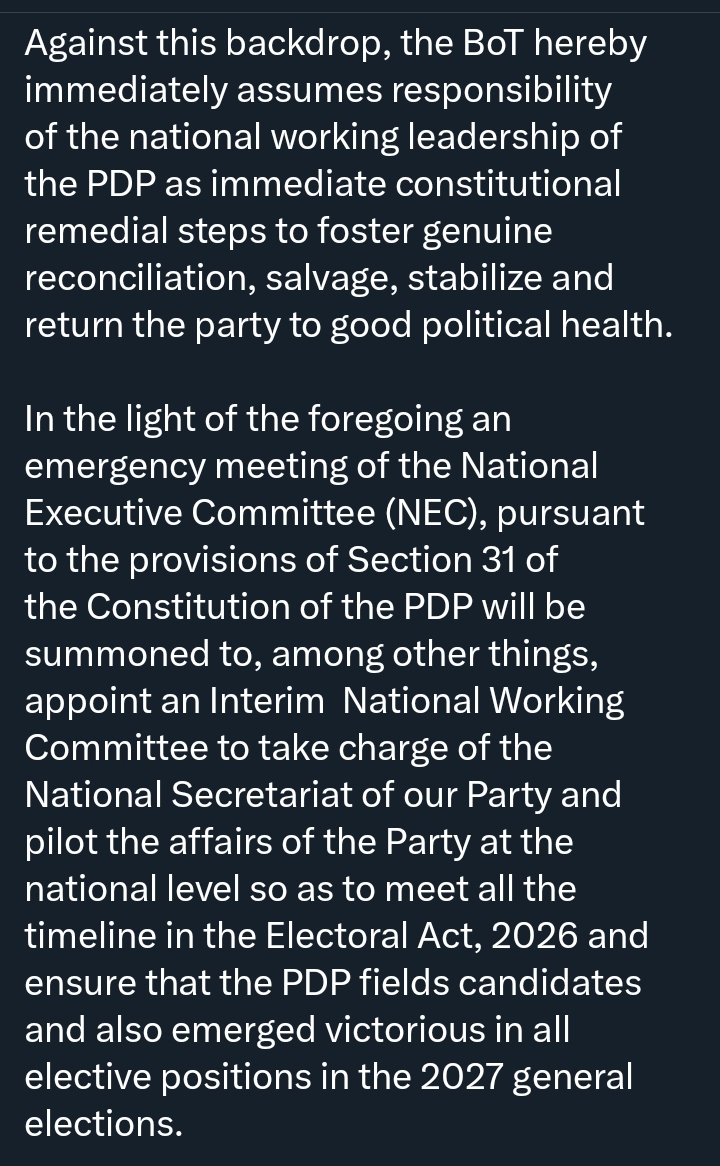 “The BoT hereby immediately assumes responsibility of the national working leadership of the PDP,” the statement read.
