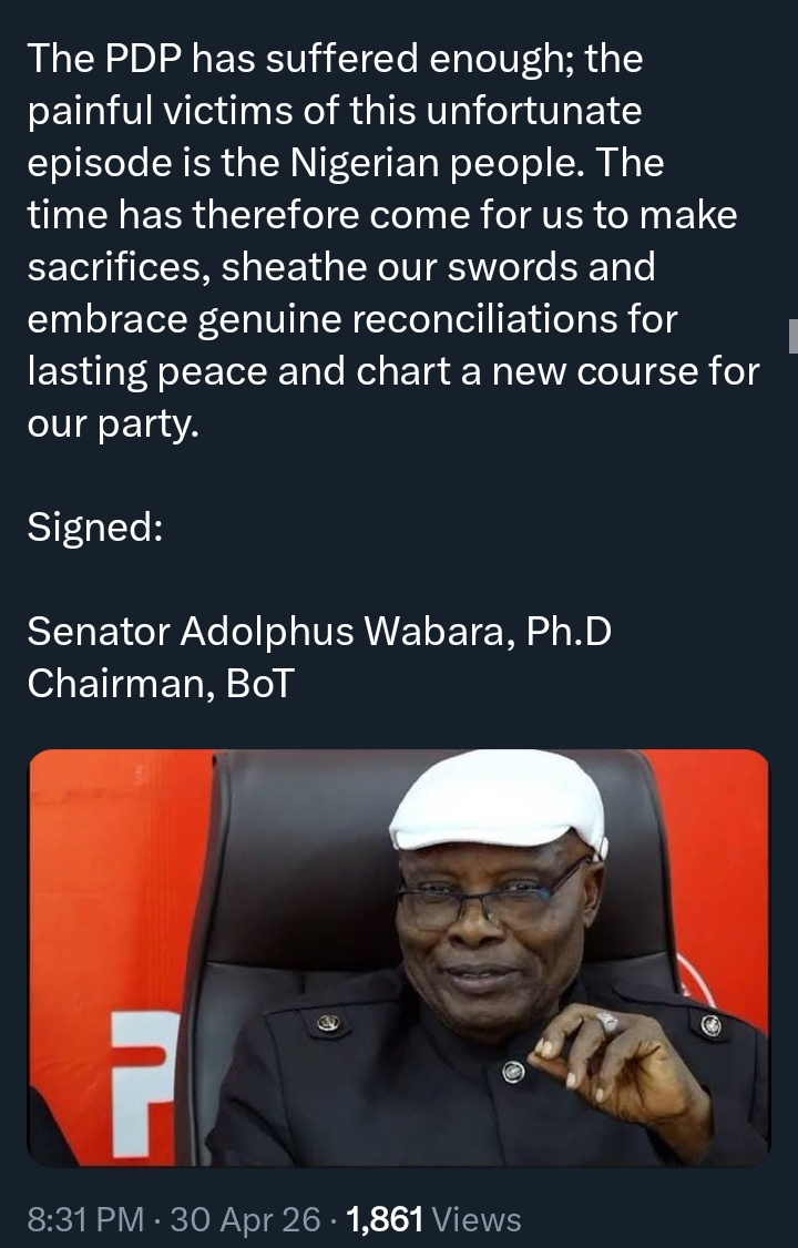 In a press statement issued on Thursday, April 30, 2026, and signed by BoT Chairman Adolphus Wabara, the party’s highest advisory body said its decision was aimed at preventing a leadership vacuum and stabilising the PDP.